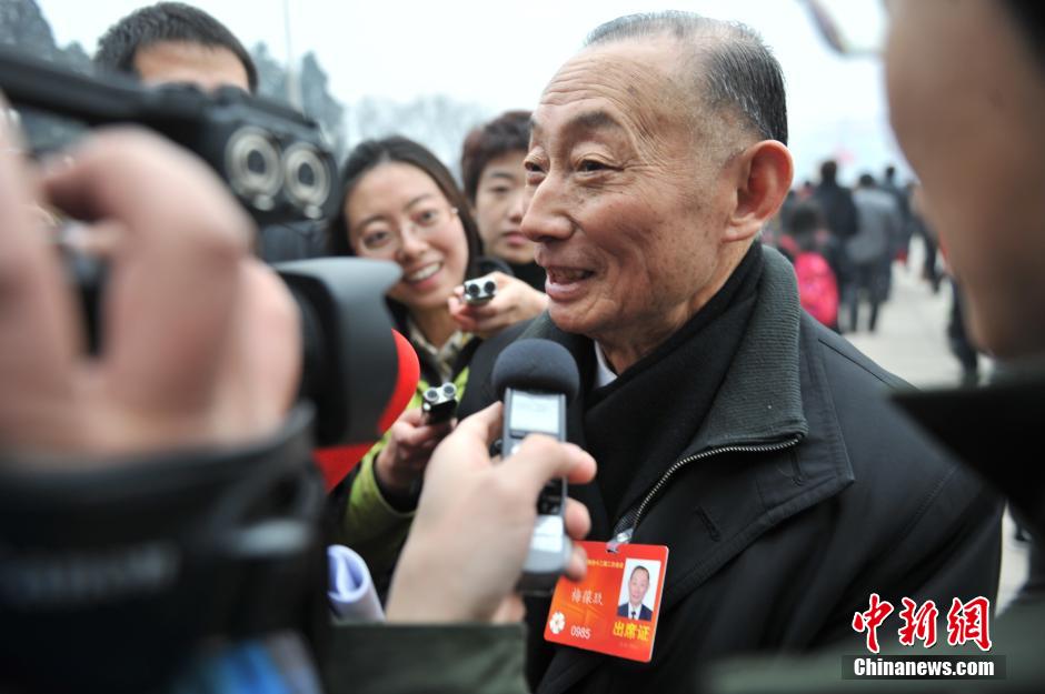 3月3日,中国人民政治协商会议第十二届全国委员会第二次会议在北京人民大会堂开幕。图为政协委员梅葆玖抵达时遭记者围堵采访。中新网记者 金硕 摄