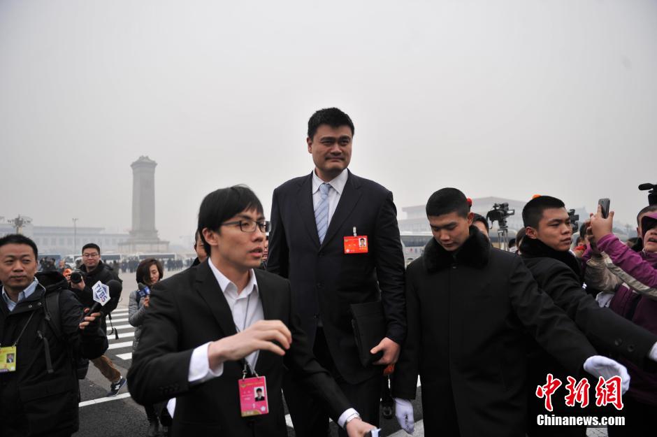 3月3日,中国人民政治协商会议第十二届全国委员会第二次会议在北京人民大会堂开幕。政协委员姚明抵达遭遇记者围堵采访。中新网记者 金硕 摄