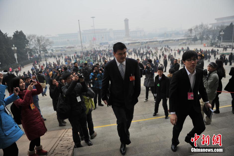 3月3日,中国人民政治协商会议第十二届全国委员会第二次会议在北京人民大会堂开幕。政协委员姚明抵达遭遇记者围堵采访。中新网记者 金硕 摄