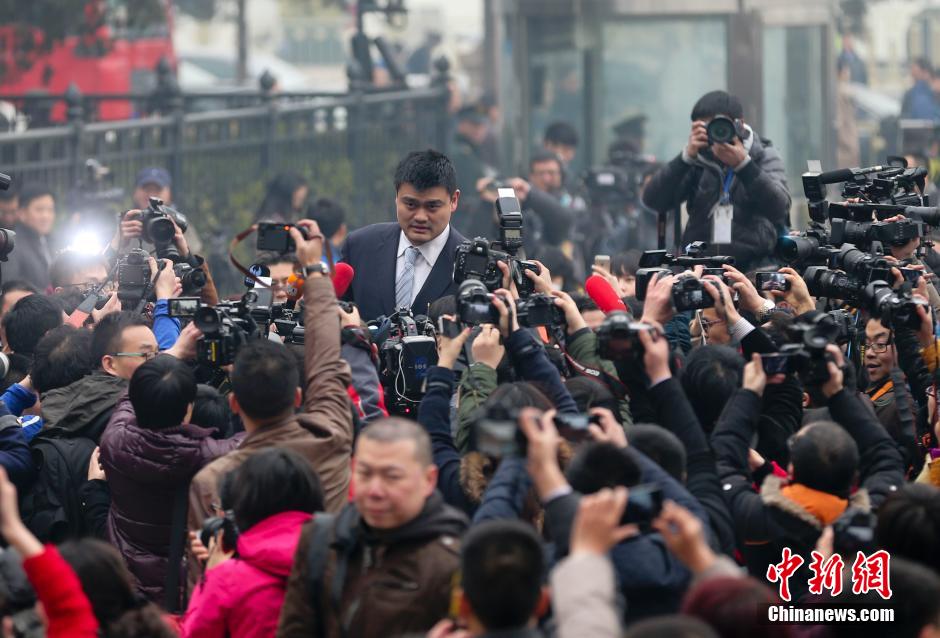 3月3日15时,中国人民政治协商会议第十二届全国委员会第二次会议在人民大会堂开幕。姚明委员在会场外接受媒体采访。中新社发 杜洋 摄