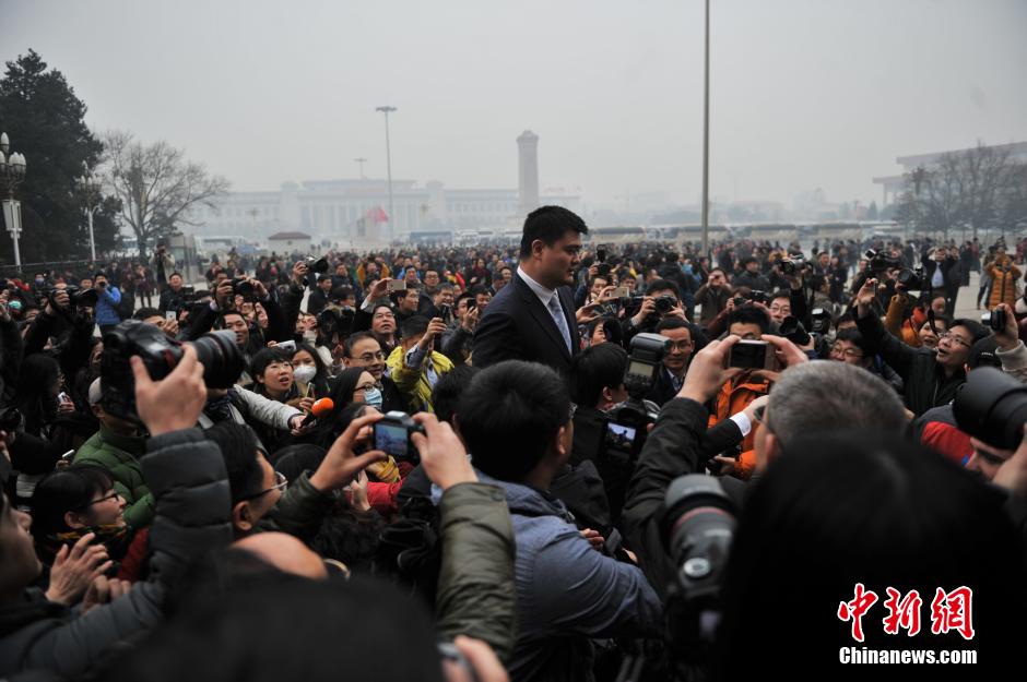 3月3日,中国人民政治协商会议第十二届全国委员会第二次会议在北京人民大会堂开幕。政协委员姚明抵达遭遇记者围堵采访。中新网记者 金硕 摄