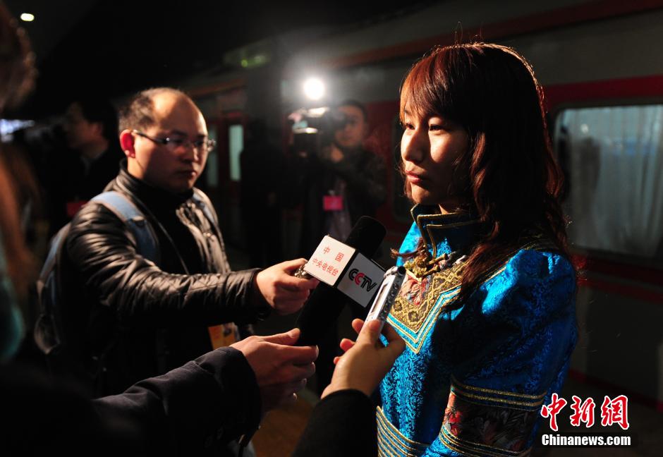3月2日,全国人大代表伊永春接受记者采访。当日清晨,参加十二届全国人大二次会议的内蒙古代表团乘坐火车抵达北京西站,成为第一个抵京的京外代表团。 中新社发 杨华峰 摄
