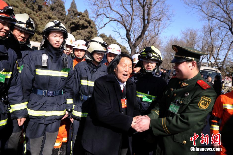 3月4日,参加十二届全国人大二次会议的人大代表申纪兰在人民大会堂外看望天安门执勤消防官兵。中新社发 陈超 摄