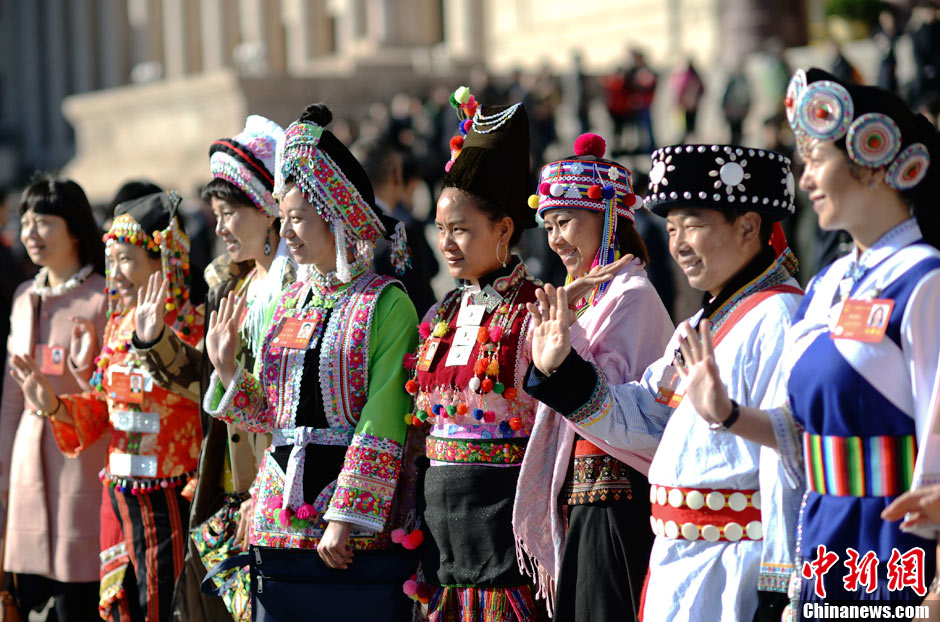 3月4日上午,十二届全国人大二次会议举行预备会议,选举大会主席团和秘书长,表决会议议程草案。图为少数民族代表参会。中新社发 廖攀 摄