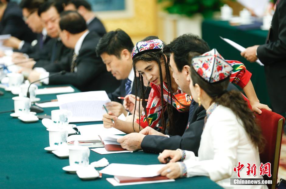 3月6日,十二届全国人大二次会议新疆代表团审议政府工作报告。中新社发 杜洋 摄