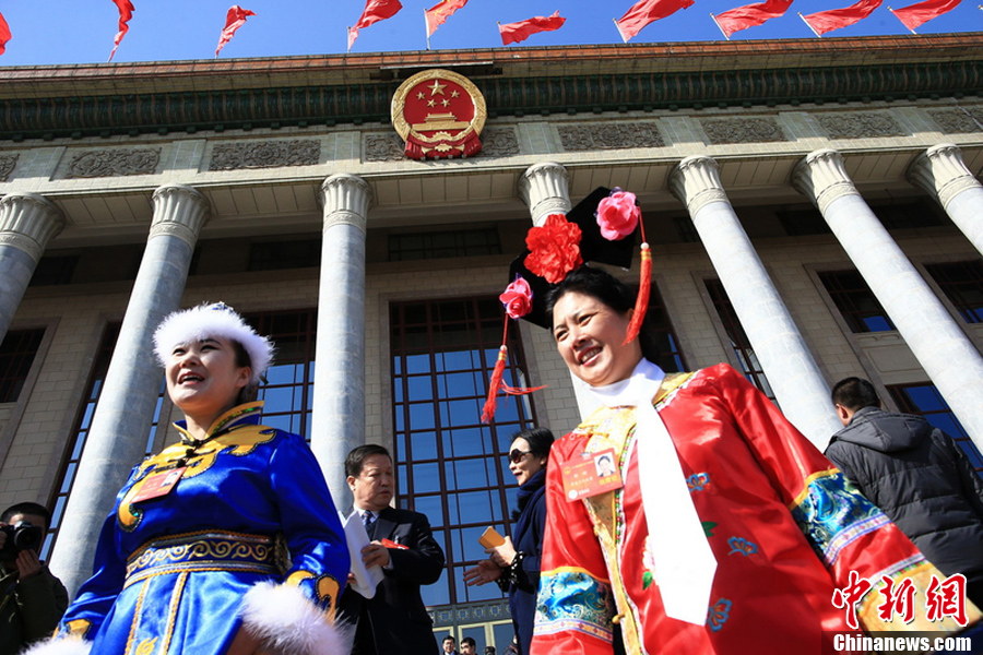 2014年3月5日,北京,2014年全国两会在北京举行。天安门广场,两名身穿民族服饰的代表很是吸引大家的眼球。高林-摄-图片来源:东方IC 版权作品 请勿转载