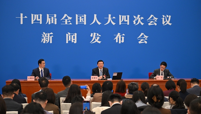 十四届全国人大四次会议4日中午举行新闻发布会,大会发言人娄勤俭就会议议程和人大有关工作回答了中外记者提问。娄勤俭介绍,本次大会5日上午开幕,12日下午闭幕,会期8天。大会议程共有11项,包括审议政府工作报告等,审查国民经济和社会发展第十五个五年规划纲要草案等,审议生态环境法典(草案)、民族团结进步促进法(草案)、国家发展规划法(草案)等三个法律案。大会的各项准备工作已全部就绪。